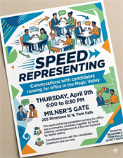 Join local candidates and community members for a fast-paced evening of conversation about issues facing the Magic Valley. Based on the format of speed dating, constituents can ask the candidates questions one-on-one.