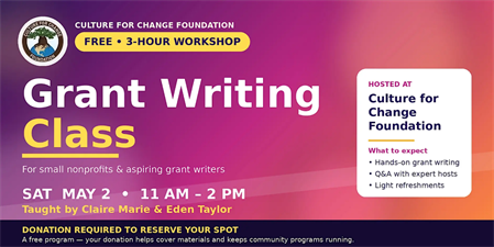 Free 3-hour grant writing class taught by Claire Marie & Eden Taylor. Open to small nonprofits and aspiring grant writers.